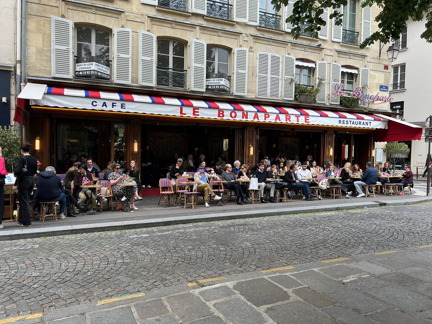 The cafés are set up in a way that facilitates people watching. Outdoor chairs are purposefully faced towards the street, as if it was theater seating and the world was the stage. From the outside looking in, it feels like you’re performing. You see quiet eyeballs on you as you walk from east to west. Some folks rudely stare at you, perhaps unaware that they’re gawking or locking gaze for far too long. Others keep it cool by breaking eye contact quickly and re-engaging in conversation with their seat mate, an almost natural move to dissipate the tension. Others remain completely oblivious to the world, sip their wine and tap away at their phone. Rest assured (or maybe get creeped out?) you are very much being watched, but you’re also part of the milieu - enjoy the ride.